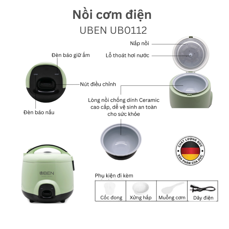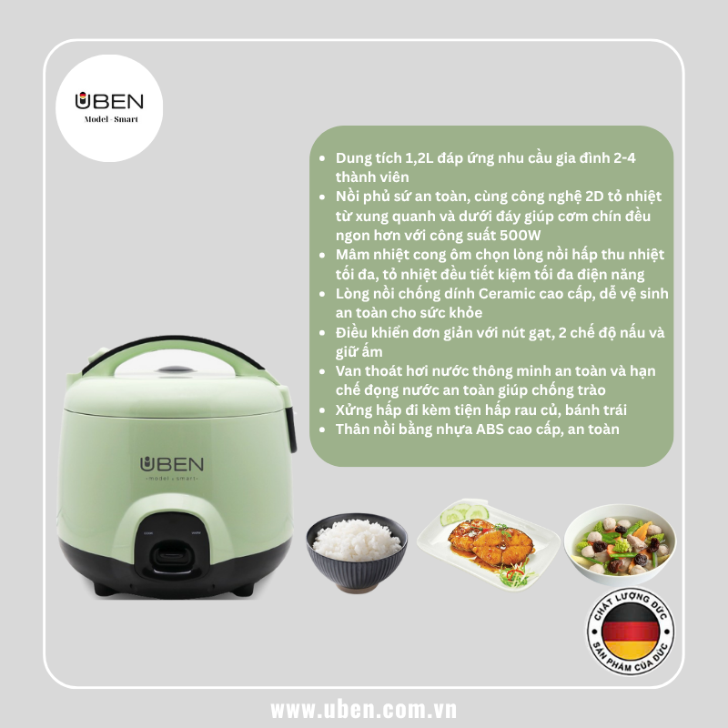 Một bữa cơm ngon luôn là linh hồn của gia đình Việt. Để có được những hạt cơm dẻo thơm, chín đều, giữ trọn dinh dưỡng thì việc lựa chọn một chiếc nồi cơm điện chất lượng là vô cùng quan trọng. Hiểu được nhu cầu đó, thương hiệu UBEN mang đến sản phẩm Nồi cơm điện UB0112, được sản xuất theo tiêu chuẩn nghiêm ngặt của LOOZN Ernährung GmbH – CHLB Đức, hứa hẹn sẽ là trợ thủ đắc lực trong căn bếp của mọi gia đình.